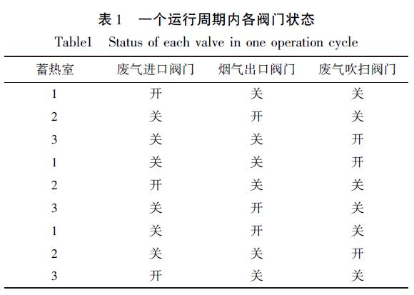 程因?yàn)槭峭ㄟ^(guò)程序控制氣動(dòng)調(diào)節(jié)閥工作, 能在短時(shí)間內(nèi)切換閥門(mén)狀態(tài), 保證三個(gè)蓄熱室一次完成蓄熱、放熱和吹掃的過(guò)程。在一個(gè)運(yùn)行周期內(nèi)每個(gè)蓄熱室下的閥門(mén)切換狀態(tài)如表1 所示。