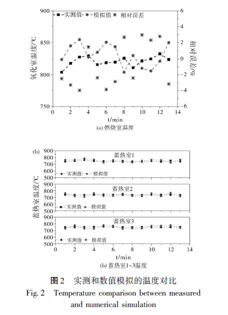 在連續(xù)監(jiān)測(cè)穩(wěn)定運(yùn)行階段多個(gè)切換周期后, 將燃燒室三個(gè)熱電偶及變送器監(jiān)測(cè)的爐膛溫度值計(jì)算得到平均值, 同時(shí)將每個(gè)蓄熱室中的出口位置熱電偶的溫度值進(jìn)行記錄, 圖2 為同一測(cè)點(diǎn)的工程實(shí)際數(shù)據(jù)與數(shù)值模擬值的對(duì)比。通過(guò)對(duì)比, 得到溫度模擬數(shù)據(jù)與實(shí)際監(jiān)測(cè)值的相對(duì)誤差均在4% 以?xún)?nèi), 這也可能