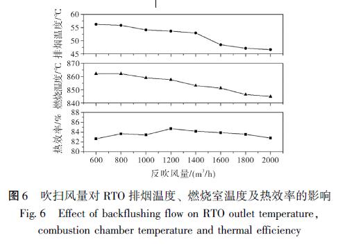 吹掃過(guò)程是通過(guò)吹掃風(fēng)機(jī)將殘留在蓄熱室內(nèi)的VOCs 帶入燃燒室, 以提高廢氣的效率[11] 。但目前RTO 反吹風(fēng)量的設(shè)計(jì)大多基于工程經(jīng)驗(yàn), 對(duì)不同工況下的實(shí)際運(yùn)行參考性不高。為了研究吹掃風(fēng)量對(duì)RTO 裝置運(yùn)行的影響, 試驗(yàn)設(shè)定在廢氣流量8000 m3 / h, 切換時(shí)間2 min 且無(wú)電加熱的條件下, 模擬吹掃風(fēng)量從600 m3 / h 增加到2000 m3 / h 時(shí)出口溫度、燃燒室溫度和熱效率變化情況。如圖6 所示。由于吹掃風(fēng)是從排至煙囪的煙氣中抽取, 實(shí)際吹掃風(fēng)中含有的VOCs 濃度較低, 無(wú)法給燃燒室提供多的。同時(shí), 過(guò)大的吹掃風(fēng)量增加了進(jìn)入進(jìn)氣和排氣蓄熱室的流量, 降低了實(shí)際發(fā)生氧化反應(yīng)的廢氣的預(yù)熱溫度, 且降低了出口溫度。雖然熱效率在1200 m3 / h 吹掃風(fēng)量附近有一定程度的增加, 但結(jié)合燃燒室溫度和經(jīng)濟(jì)因素,800 ~1000 m3 / h 區(qū)間內(nèi)較為合理與實(shí)際工程經(jīng)驗(yàn)吹掃風(fēng)量占進(jìn)氣流量的10% 左右結(jié)論相近[12] 。同時(shí)可以看出, 吹掃風(fēng)量越大, 燃燒室的溫度越低, 需要開(kāi)啟電加熱器提供熱量來(lái)提高燃燒室的溫度, 增加運(yùn)行成本。